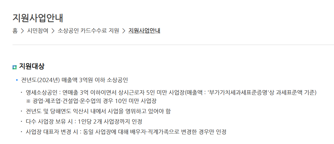 2024년 연 매출 3억 원 이하의 영세 소상공인이 대상입니다. 사업자 1인당 최대 두 개 사업장까지 신청이 가능하며, 카드수수료의 0.5% 범위 내에서 최대 150만 원까지 지원됩니다.