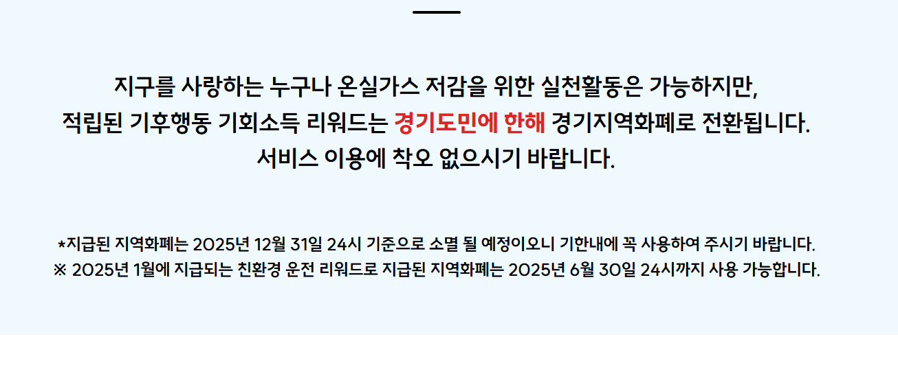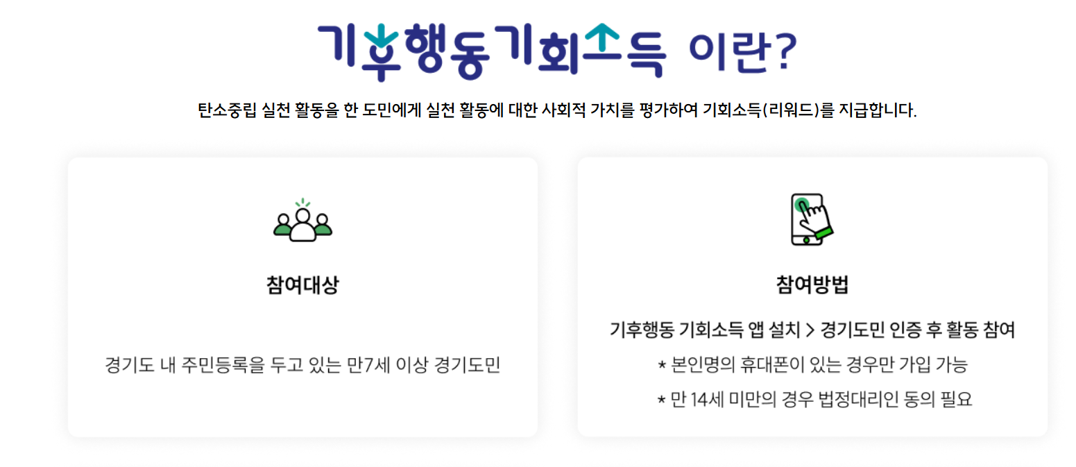만 7세 이상 경기도민이면 누구나 참여 가능하며, 일상생활 속에서 기후를 위한 행동을 실천하고 그에 대한 보상으로 리워드(지역화폐)를 지급받게 됩니다.