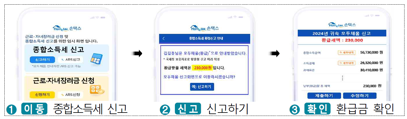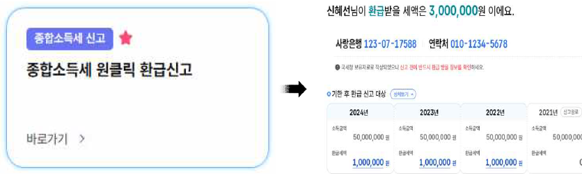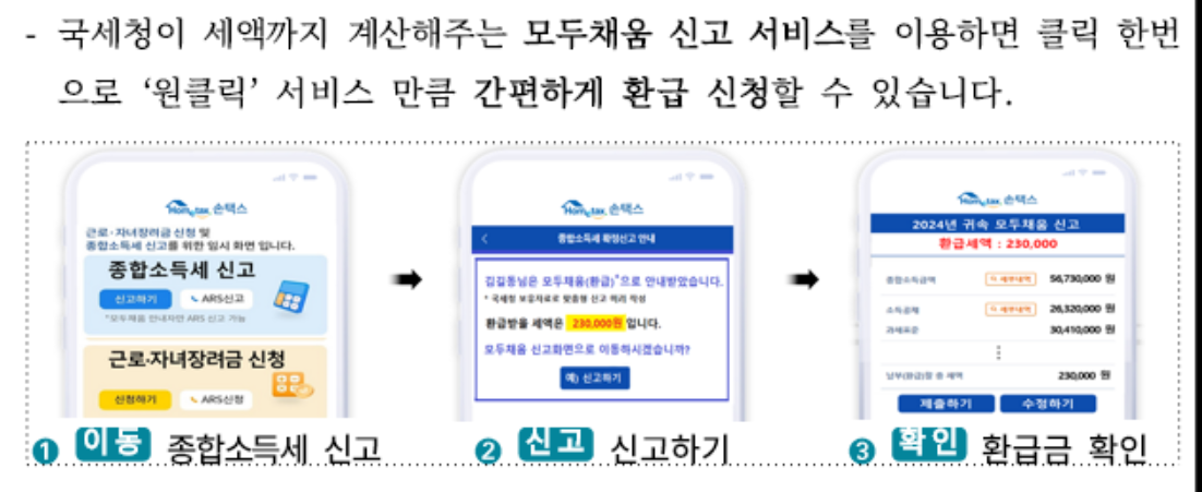 보다 편리하게 종합소득세를 환급받을 수 있도록 ‘원클릭 환급 서비스’를 개통하였습니다. 이 서비스는 홈택스(Hometax)를 통해 제공되며, 별도의 수수료 없이 환급 대상자가 자신의 환급 가능 금액을 최대 5년까지 한눈에 확인하고 바로 신청할 수 있습니다.