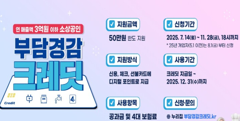 2025년부터 시행되는 소상공인부단경감크레딧 지원은 경영에 필요한 기본 비용을 덜어주기 위한 제도로 신청시 최대 50만원까지 디지털 포인트 형태로 지급됩니다.