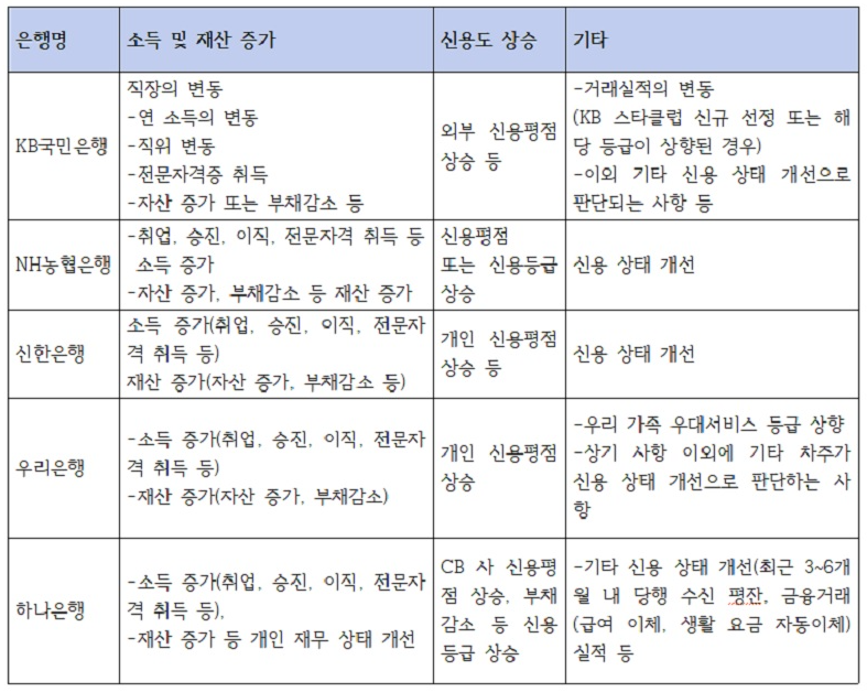 평가를 하는 기준은 총 3가지 인데, 소득 및 재산의 증가 또는 신용도의 상승 또는 기타(당행 수신거래 증가 또는 이외 본인의 신용상태가 개선되었다고 생각하는 경우 등 입니다.
