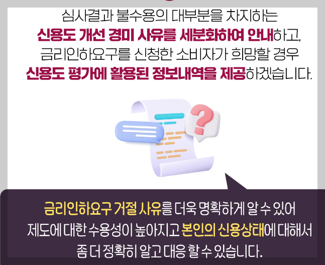 최근 금융위원회에서 적극적으로 홍보하는 이유도 금리인하요구권에 대한 신청 건수가 증가하고 있지만 금융권의 수용률이 오히려 하락한다는 말이 있어서 소비자에게 좀 더 도움이 되도록 개선한다고 합니다.