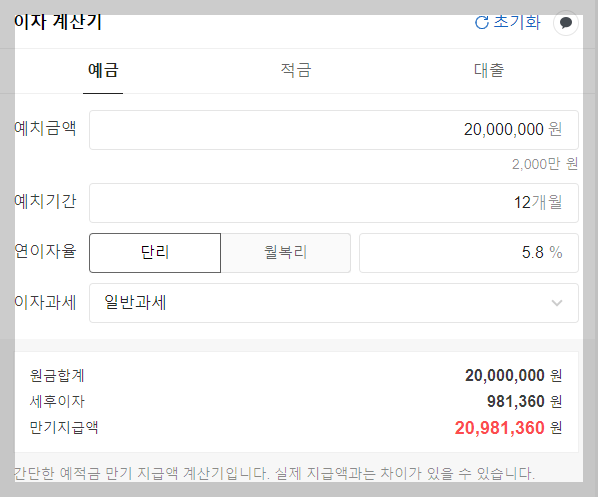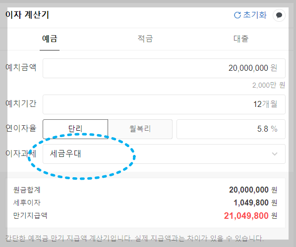 만약 1,000만원을 예금에 거치한 후에 일반과세(15.4%)로 세금을 제외하고 실제 수령하게 되면 내가 받을 수 있는 이자는 58만원에서 49만원정도로 줄어들며 1,049만원을 수령하게 됩니다.