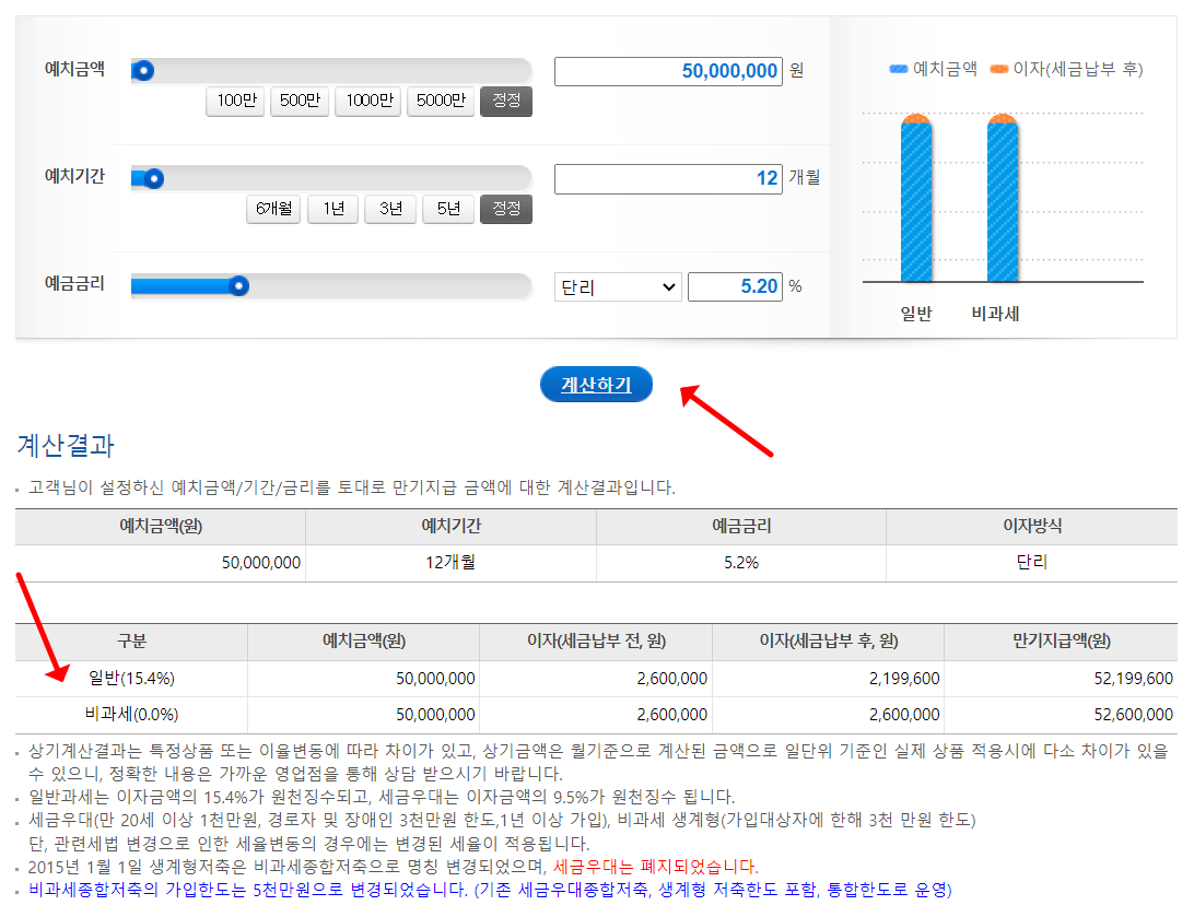 만약 가장 높은 5.2% 금리를 했을 때 예금자보호 되는 5,000만원을 예치하면 세전/세후 이자는 얼마가 될까요?