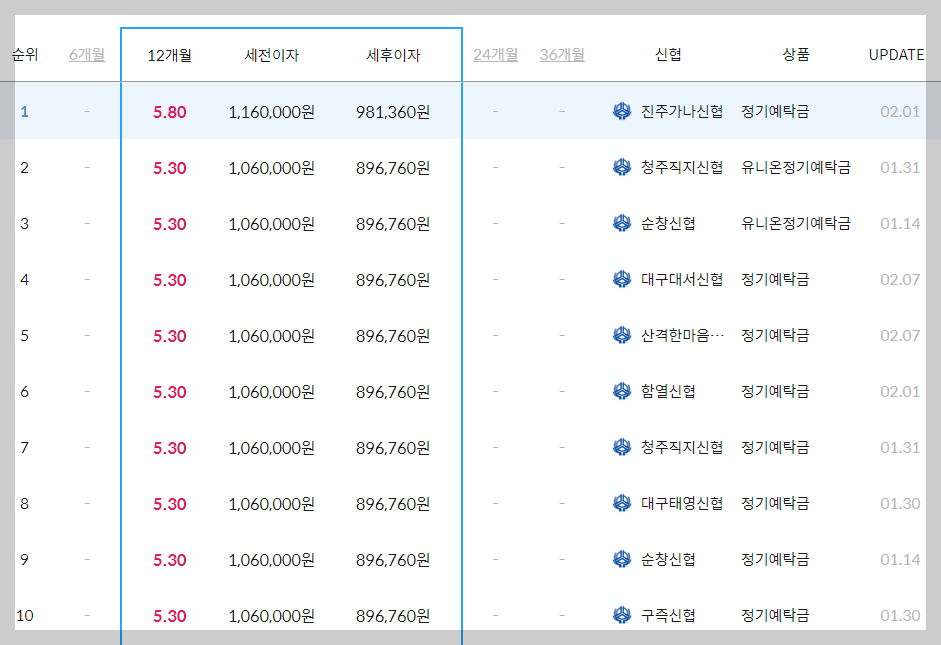 월요일에 기준이 업데이트 되었는데 현재 금리가 제일 높은 곳은 신협 정기예탁금이며 5.8% 판매하는 상품입니다.