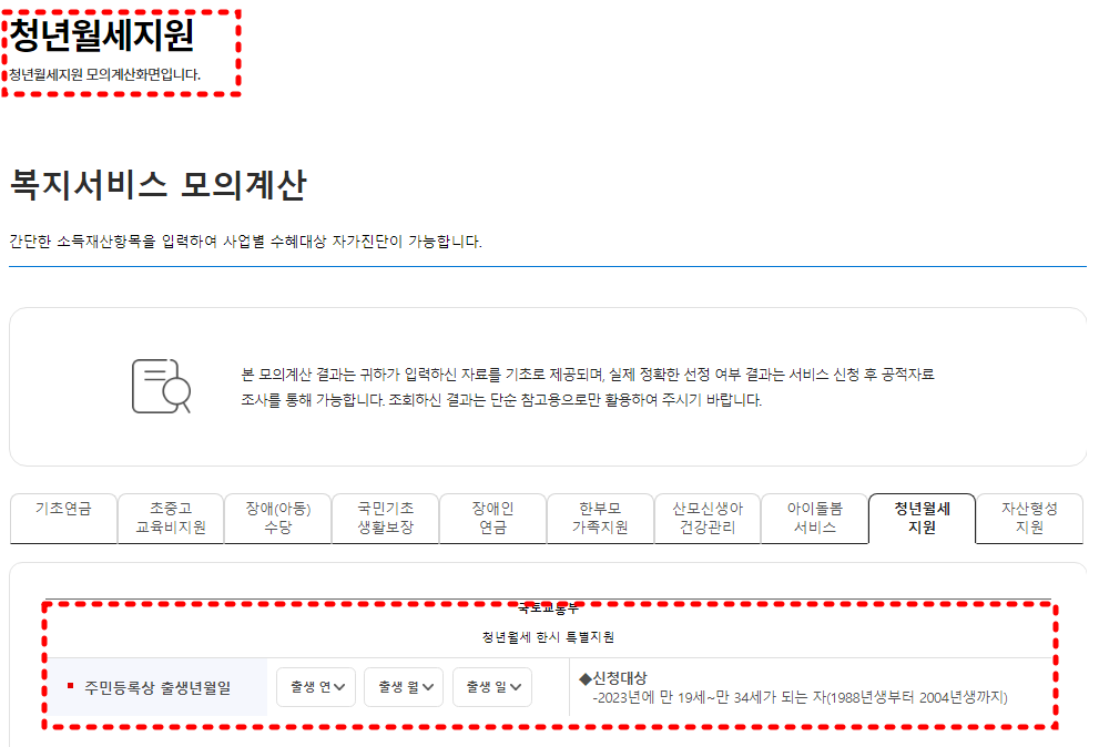 복지로 홈페이지에는 청년월세지원 자격요건이 되는지 모의계산 서비스를 제공하고 있습니다.