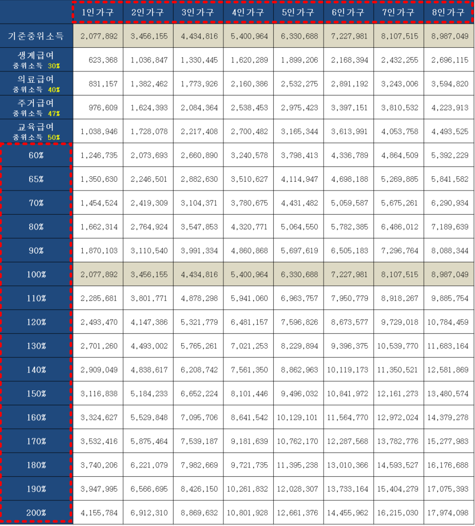대한민국 소득 중간값을 매긴 표를 말하며, 가구원 수에 따라 매 년 그 기준금액이 달라집니다.
