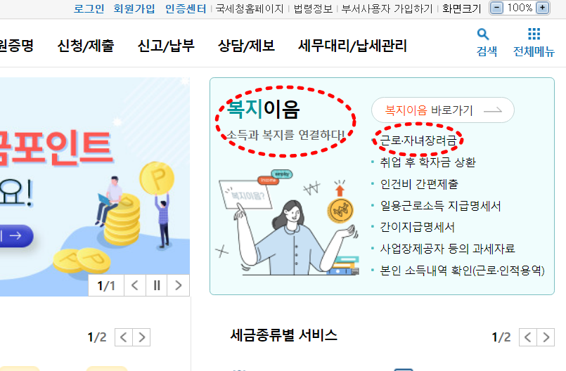 인터넷 홈페이지에 접속해서 메인화면 우측에 있는 '복지이음' 메뉴에서 '근로/자녀장려금'을 눌러주세요.