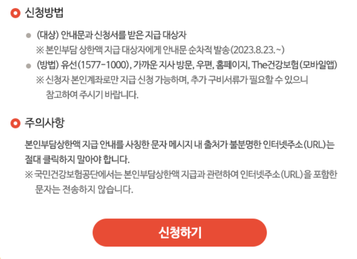 지급 대상자분들은 8월 23일(수)부터 본인부담상한액 초과금 지급신청 안내문을 받게 될 예정입니다. 이 안내문을 수령하신 분들은 국민건보공단에 신청을 완료하시면 됩니다.
