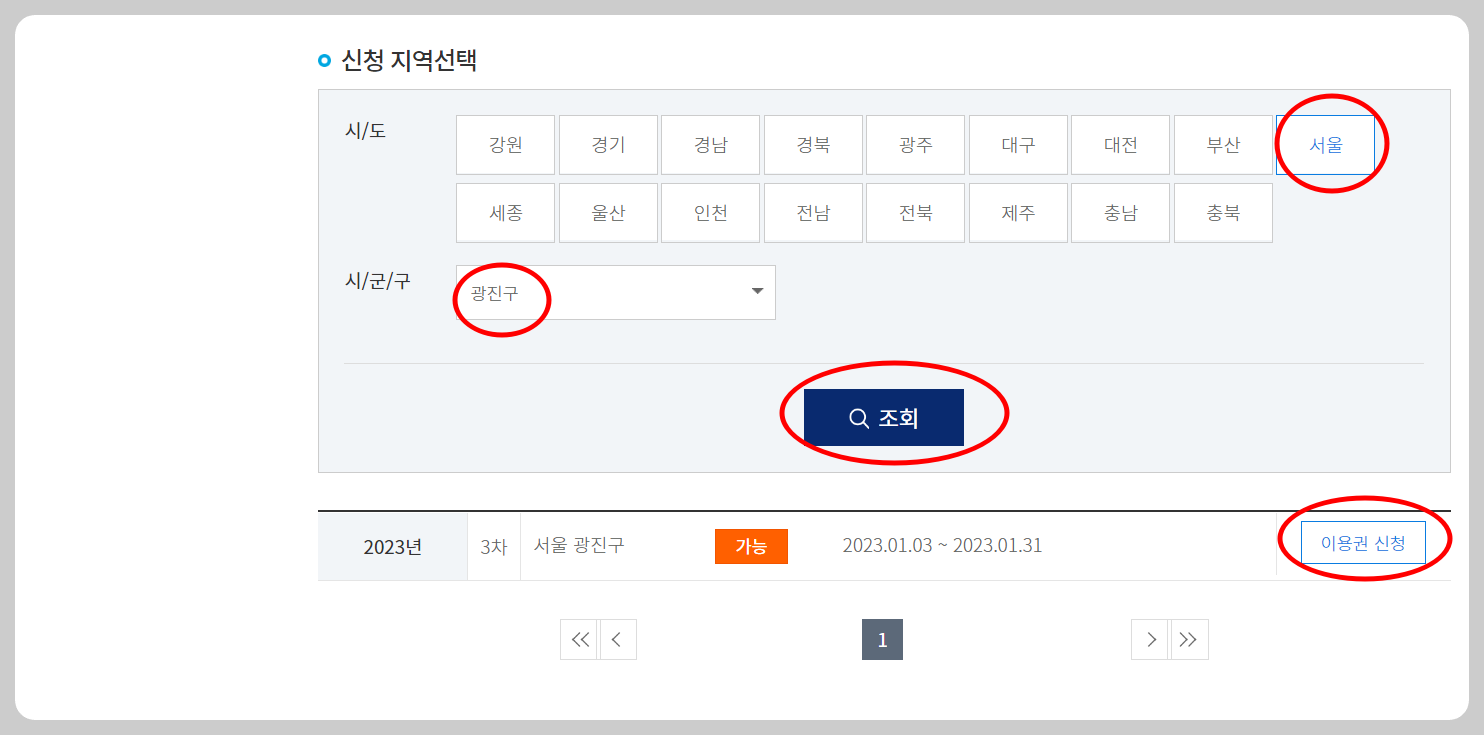 - 신청지역 선택 및 조회, 신청가능지역 선택하여 이용권 신청 클릭