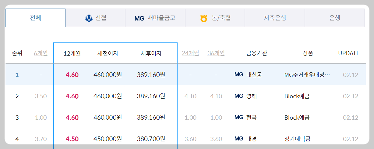 홈페이지에 들어가면 신협, 새마을금고, 농/축협, 저축은행으로 메뉴가 나뉘어 지게 되는데요, 특별히 선호하는 은행이 있는 것이 아니라면 '전체'에 두시고 금리를 보시면 됩니다.