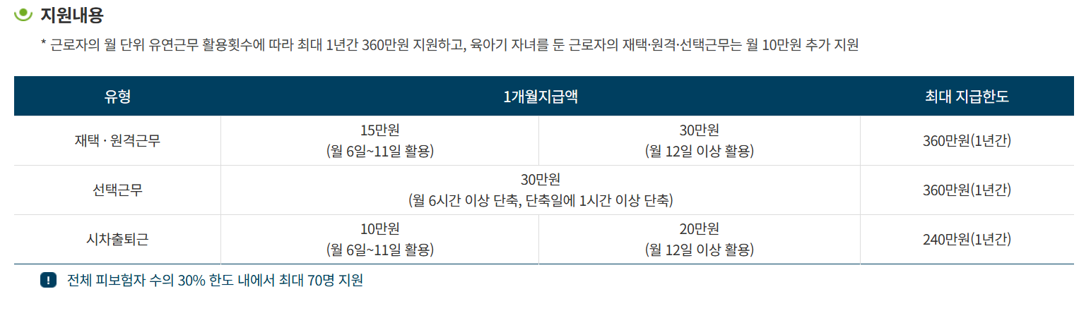정부는 이러한 유연근무제 관련 법 개정 외에도 근로자 지원금을 확대하고, 유연근무 활용 장려금을 추가적으로 지급할 계획입니다.