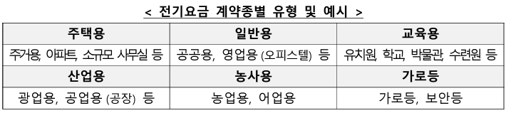 사업장에서 사용하는 전기 용도는 일반용, 산업용, 농사용, 교육용, 주택용(비주거용)으로 한정되어 있습니다.