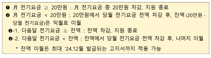 -지원: 직접 계약자: 대상자 통지 이후 최초 전기요금 고지서부터 차감 적용, 비계약 사용자: 대상자 통지 후 5일 이내(영업일 기준) 전기요금 납부금액 환급