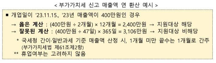 또한, 국세청 조회 시 부가가치세 신고매출액(연간)이 3000만원 이하인 경우에만 신청이 가능합니다. 2023년 개업한 경우에는 개업 이후 월 평균 매출액을 기준으로 연 환산됩니다.