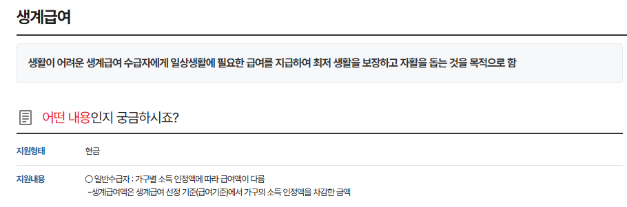 생계급여는 국민기초생활보장법에 따라 생계유지가 어려운 가구에 대해 생활비를 지원하는 제도입니다. 생계급여는 가구의 소득 인정액이 최저생계비 이하일 때 지원되며 신청대상자라면 신청해야 합니다.