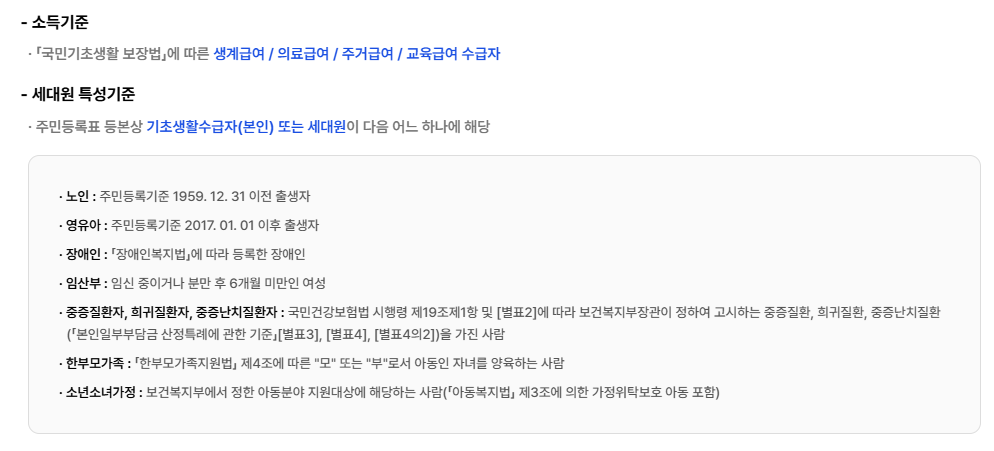 - 기초생활수급자 (생계급여, 의료급여, 주거급여, 교육급여 수급 가구)