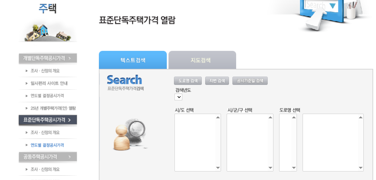 - 홈페이지에 접속 후 '공시지가 조회' 메뉴를 클릭